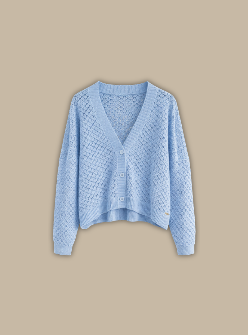 Seu tricot trabalhado cria um desenho sutil inspirado nas formas naturais das conchas, adicionando profundidade e elegância à peça. O decote em V com três botões frontais permite diferentes formas de uso — fechado para um visual mais clássico ou aberto para sobreposições leves e descontraídas.